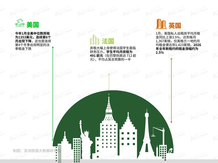 本文来自微信公众号"空间秘探",作者:ABNData,36氪经授权发布。 1月亚洲(中国)长租公寓市场综述 01 全球公寓市场发展动态 1月,进入2026年新年,根据亚洲旅宿大数据研究院监测数据显示,房租类指数年增长率涨幅持续趋缓,1月年增 率1.99%,跌破2%,反映过去一段时间全球租金上涨过后,基数已高下,涨势有趋缓迹象,但全球租金价格总体 仍呈现高位态势。 美国方面,2026年新年开始才一个月,洛杉矶及全美的房租已降至四年来的最低点。据租房匹配平台"公寓列 表"(Apartment List)数据,今年1月全美中位数房租(1,353美元)连续第6个月出现下降,这也是连续第4个冬季 出现明显的淡季租金下跌。冬季租房者通常减少,租金疲软符合市场的季节性规律。不过,0.2%的月跌幅是去年 8月以来最小的。报告认为,这表明市场正逐渐走出淡季,租金有望在未来几个月恢复增长。数据显示,全美54个 人口逾百万的大都市区,有39个于本月出现房租环比下降,32个同比下降——后者主要集中在南部和西部山区, 而东北部、中西部和西海岸部分地区的租房市场仍在升温。 房租年度增幅最大的都市区是弗吉尼亚州的弗吉尼亚海滩市(5.0%) ...