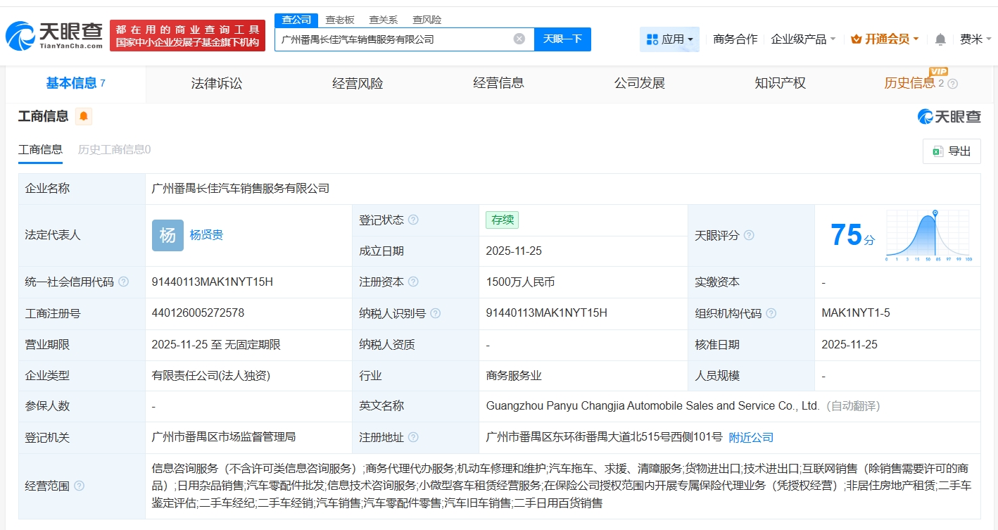 Core Insights - Guangzhou Panyu Changjia Automobile Sales and Service Co., Ltd. has been established with a registered capital of 15 million RMB, and is fully owned by GAC Group's GAC Trading Co., Ltd. [1][2] Company Information - The legal representative of the company is Yang Xian Gui [2] - The company is registered as a limited liability company (sole proprietorship) [2] - The business scope includes information consulting services, business agency services, motor vehicle repair and maintenance, and other related services [1][2] Registration Details - The company was established on November 25, 2025, and has an indefinite business term [2] - The unified social credit code is 91440113MAK1NYT15H [2] - The registered address is located at No. 101, West Side, Panyu Avenue North, Donghuan Street, Panyu District, Guangzhou [2]