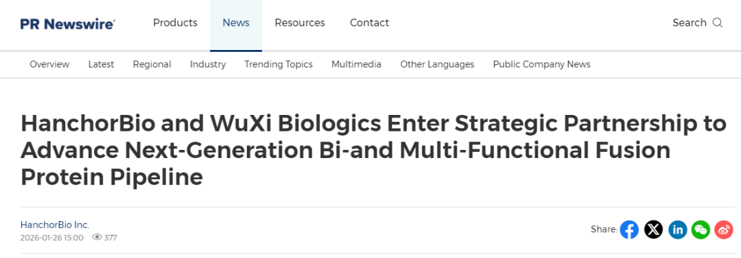SHANGHAI, Jan. 26, 2026 /PRNewswire/ -- WuXi Biologics (2269.HK), a global leading Contract Research, Development and Manufacturing Organization (CRDMO), and HanchorBio Inc. (TPEx: 7827), a global clinical-stage biotechnology company advancing next-generation immunotherapies for oncology and autoimmune diseases, jointly announced today the signing of a strategic collaboration agreement on the development and manufacturing of multiple next-generation bi-/multi-functional fusion programs from HanchorBio’s pip ...