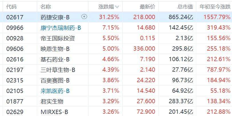 | 代码 | 名称 | | 涨跌幅 √ | 最新价 | 总市值 | 年初至今涨跌 | | --- | --- | --- | --- | --- | --- | --- | | 02617 | 药捷安康-B | (0) | 31.25% | 218.000 | 865.24亿 | 1557.79% | | 09966 | 康宁杰瑞制药-B | | 7.15% | 14.680 | 142.45亿 | 319.43% | | 00928 | 帝王国际投资 | | 5.50% | 0.115 | 2.13亿 | 155.56% | | 09606 | 映恩生物-B | | 5.00% | 336.000 | 295.8亿 | 255.18% | | 02616 | 基石药业-B | | 4.66% | 7.190 | 106.12亿 | 212.61% | | 02197 | 三叶草生物-B | | 4.39% | 2.140 | 27.76亿 | 787.97% | | 02315 | 百奥塞图-B | | 3.86% | 24.220 | 96.73亿 | 184.94% | | 02105 | 来凯医药-B ...