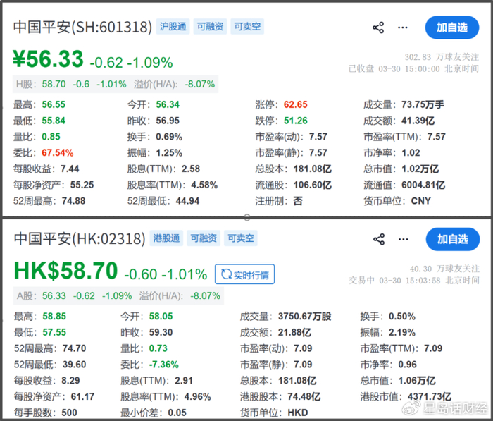3月27日上午, 中国平安 (02318.HK/601318.SH)2025年度业绩发布会在上海与香港两地同步举行。面 对市场关注的业绩波动、战略布局、投资方向等核心问题,中国平安总经理兼联席首席执行官谢永林、 联席首席执行官兼副总经理郭晓涛、副总经理兼首席财务官付欣等核心管理层悉数出席并逐一回应。 3月30日,中国平安A股及港股开盘后均一路走低,截至当日15时,港股报58.7港元/股,下跌1.01%;A 股报56.33元/股,下跌1.09%。 | 中国平安(SH:601318) 沪股通 可融资 可卖空 | | | | 加自选 | | --- | --- | --- | --- | --- | | ¥56.33 -0.62 -1.09% | | | 已收盘 03-30 15:00:00 北京时间 | 302.83 万球友关注 | | H股: 58.70 -0.6 -1.01% 溢价(H/A): -8.07% | | | | | | 最高:56.55 | 今开:56.34 | 涨停:62.65 | 成交量:73.75万手 | | | 最低:55.84 | 昨收:56.95 | 跌停:51.26 | 成交额:41 ...