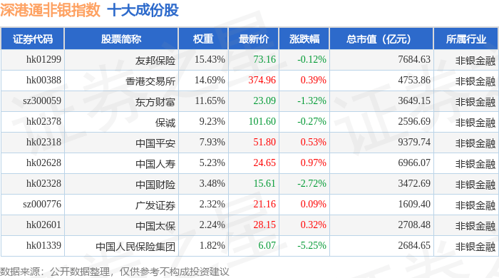 资金流向方面,深港通非银(983053)指数成份股当日主力资金净流出合计12.88亿元,游资资金净流入 合计2.43亿元,散户资金净流入合计10.46亿元。成份股资金流向详情见下表: 证券之星消息,12月1日,深港通非银(983053)指数报收于7020.28点,跌0.35%,成交201.59亿元,换 手率0.54%。当日该指数成份股中,上涨的有34家,长江证券以2.27%的涨幅领涨,下跌的有20家,海德 股份以9.97%的跌幅领跌。 深港通非银(983053)指数十大成份股详情如下: | 证券代码 | 股票简称 | 权重 | 最新价 | 涨跌幅 | 总市值(亿元) | 所属行业 | | --- | --- | --- | --- | --- | --- | --- | | hk01299 | ■ 友邦保险 | 15.43% | 73.16 | -0.12% | 7684.63 | ■ 非银金融 | | hk00388 | 香港交易所 | 14.69% | 374.96 | 0.39% | 4753.86 | 非银金融 | | sz300059 | 东方财富 | 11.65% | 23.09 | -1.32% ...