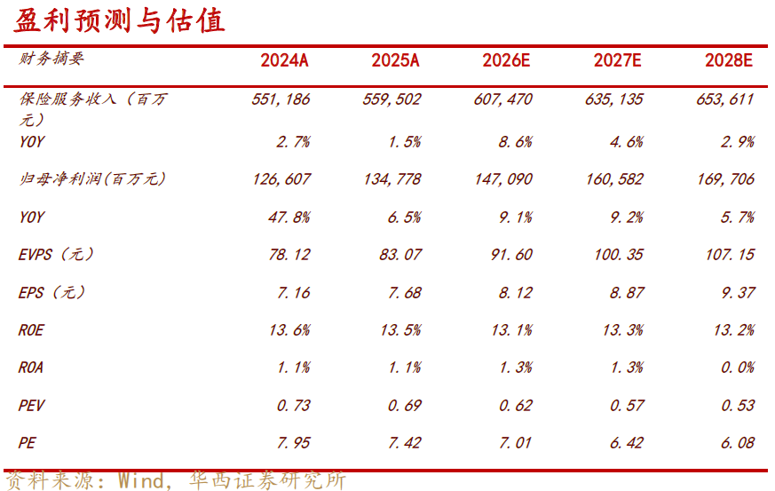 业绩概述:2025 年归母净利润1348 亿元,同比+6.5%,Q4 受成长股投资浮亏、非经常性损益拖累,归 母净利润同比-74%;剔除一次性扰动后扣非净利润同比+22.5%。归母营运利润同比+10.3%,寿险 NBV/EV 分别同比+29.3%/+11.2%,财险COR 优化1.5pct 至96.8%,DPS 2.7 元,同比+5.9%。 寿险:渠道结构优化,队伍质态持续提升。银保渠道NBV 同比+138%,占比提升至25.5%,成核心增长 点;个险代理人规模35.1 万人,同比-3.3%,人均NBV 同比+17.2%,队伍质态明显优化。全年NBVM 同比提升4.9pct至23.4%,个险与银保渠道价值率均实现显著提升。 投资建议:资负协同发力+高股息属性,公司为攻守兼备标的。3 月27 日平安静态股息率4.7%,我们预 计公司2026-2028 年归母净利润为1553、1709、1781 亿元,同比增长15.2%、10.1%、4.2%,3 月27 日 对应PEV 为0.64、0.59、0.56 倍,维持"买入"评级。 风险提示:利率下行风险、权益市场波动风险、保费承压风险。 偿付能力:核心指标稳健,风险抵 ...