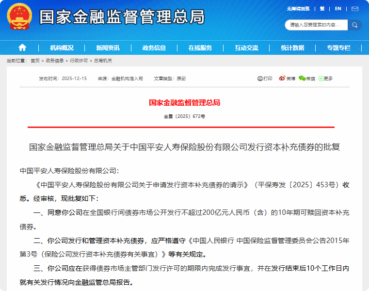平安人寿获批发行不超过200亿元资本补充债券
