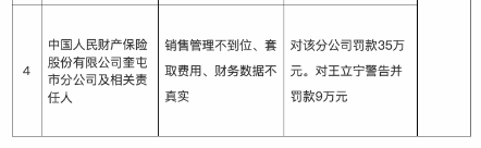 | | 中国人民财产保险 | 销售管理不到位、套 对该分公司罚款35万 | | --- | --- | --- | | ঘ | 股份有限公司奎屯 | 取费用、财务数据不 元。对王立宁警告并 | | | 市分公司及相关责 | | | | 任人 | 真实 罚款9万元 | 截图:国家金融监督管理总局官网 凤凰网财经讯 11月21日,据国家金融监督管理总局官网消息,中国人保财险奎屯市分公司因销售管理 不到位、套取费用、财务数据不真实3项违规被罚款35万元,相关责任人王 立宁受到警告并被罚款9万 元。 ...
