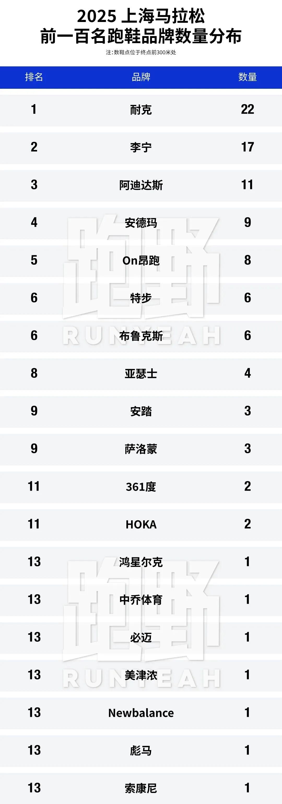 作为国内马拉松赛季在年末的焦点之战,2025年上海马拉松今天刚刚结束,作为中国仅有的两场世界田联白金标赛事之一,今年它创下超过35万人的报名 新纪录。 从最终成绩来看,作为其在国内唯一赞助的顶级马拉松赛事,耐克强势捍卫了自己的"主场",男子和女子全场前三名的六位全球精英选手全部穿着耐克跑 鞋冲线,其中Alphafly 3与Vaporfly系列成为赛道上的最大赢家。而国内选手的成绩榜有两个冲击者:国内男子冠军丰配友穿着特步160X 7.0 PRO以2:08:36 的成绩完赛,杨克古和李大林紧随其后,均选择了Nike Alphafly 3;女子组方面,张德顺与吴冰包揽前两名,同样穿着Nike Alphafly 3,季军姚妙也拿到跟 去年同样的排名,她穿的是萨洛蒙刚刚推出的S/LAB PHANTASM 3。 | 排名 | | 品牌 | | 数量 | | --- | --- | --- | --- | --- | | 1 | | 耐克 | | 22 | | 2 | | 李宁 | | 17 | | 3 | | 阿迪达斯 | | 11 | | 4 | | 安德玛 | | 9 | | 5 | | On昂跑 | | 8 | ...