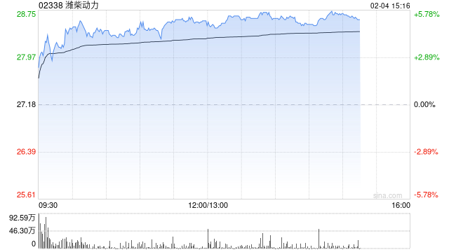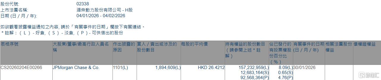 增持后,JPMorgan Chase & Co.最新持好仓数目为157,232,959股,持好仓比例由7.99%上升至8.09%。 | 股份代號: | 02338 | | --- | --- | | 上市法國名稱: | 濰柴動力股份有限公司 | | 日期 (日 / 月 / 年): | 04/01/2026 - 04/02/20 A .. . | 格隆汇2月4日丨根据联交所最新权益披露资料显示,2026年1月30日,潍柴动力(02338.HK)获JPMorgan Chase & Co.以每股均价26.4212港元增持好仓189.46万 股,涉资约5005.78万港元。 | 不在地球 | 大股東/董事/最高行政人員名 作出披露的 買入 / 賣出或涉及的 每股的平均價 | | | | | 持有權益的股份數目 佔已發行的 有關事件的日期 | | --- | --- | --- | --- | --- | --- | --- | | | 股份到量 | | | | 請參閱 上亦 * 註 | 有投票楼股(日/月/年) | | | | | | | | 优自分比 | | CS20260204E00266 | JPMorgan ...
