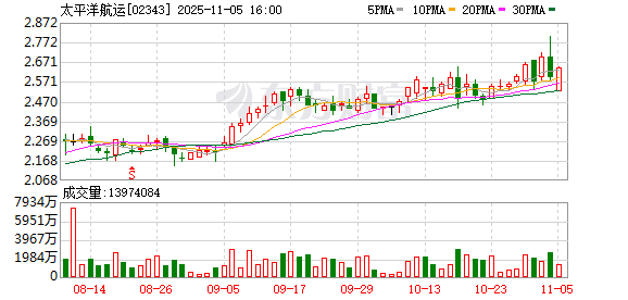 证券时报·数据宝统计,太平洋航运在港交所公告显示,11月5日以每股2.520港元至2.630港元的价格回 购515.90万股,回购金额达1353.88万港元。该股当日收盘价2.640港元,上涨1.93%,全天成交额 3656.84万港元。 太平洋航运回购明细 | 日期 | 回购股数(万股) | 回购最高价(港元) | 回购最低价(港元) | 回购金额(万港元) | | --- | --- | --- | --- | --- | | 2025.11.05 | 515.90 | 2.630 | 2.520 | 1353.88 | | 2025.11.04 | 1000.00 | 2.640 | 2.580 | 2609.20 | | 2025.10.27 | 0.80 | 2.530 | 2.530 | 2.02 | | 2025.10.24 | 3.50 | 2.520 | 2.520 | 8.82 | | 2025.10.23 | 5.20 | 2.500 | 2.500 | 13.00 | | 2025.09.17 | 600.00 | 2.520 | 2.450 | 1495.26 | | 2025.09 ...