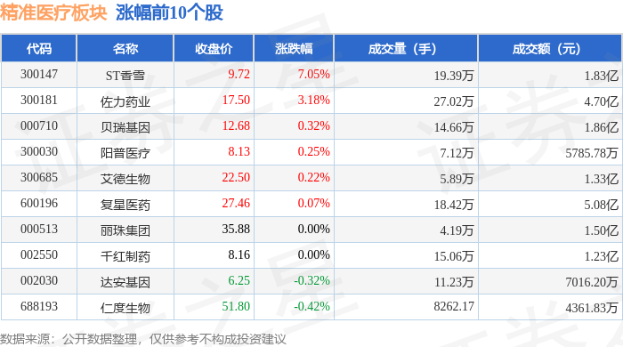 | 代码 | 名称 | 收盘价 | 涨跌幅 | 成交量(手) | 成交额(元) | | --- | --- | --- | --- | --- | --- | | 300147 | ST香雪 | 9.72 | 7.05% | 19.39万 | 1.83亿 | | 300181 | 佐力药业 | 17.50 | 3.18% | 27.02万 | 4.70亿 | | 000710 | 贝瑞基因 | 12.68 | 0.32% | 14.66万 | 1.86亿 | | 300030 | 阳普医疗 | 8.13 | 0.25% | 7.12万 | 5785.78万 | | 300685 | 又德生物 | 22.50 | 0.22% | 5.89万 | 1.33亿 | | 600196 | 复星医药 | 27.46 | 0.07% | 18.42万 | 5.08亿 | | 000513 | 刚珠集团 | 35.88 | 0.00% | 4.19万 | 1.50亿 | | 002550 | 千红制药 | 8.16 | 0.00% | 15.06万 | 1.23亿 | | 002030 | 达安基因 | 6.25 | -0 ...