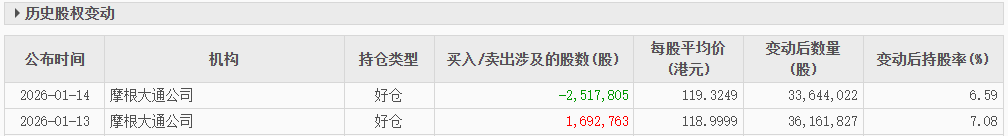 中国经济网北京1月20日讯 智通财经网消息《摩根大通减持药明康德(603259)(02359)约251.78万股 每股作价约119.32港元》显示,香港联交 所最新资料显示,1月14日,摩根大通减持药明康德(02359.HK)251.7805万股,每股作价119.3249港元,总金额约为3亿港元。减持后最新持股数 目约为3364.40万股,最新持股比例为6.59%。 | ▶ 历史股权变动 | | | | | | | | | --- | --- | --- | --- | --- | --- | --- | --- | | 公布时间 | | 机构 | 持仓类型 | 买入/卖出涉及的股数(股) | 每股平均价 (港元) | 变动后数量 (股) | 变动后持股率(%) | | 2026-01-14 | 摩根大通公司 | | 好它 | -2, 517, 805 | 119. 3249 | 33,644,022 | 6.59 | | 2026-01-13 | 摩根大通公司 | | 好仓 | 1,692,763 | 118.9999 | 36, 161, 827 | 7.08 | 资料显示,摩根大通公司1月14日减持2, ...