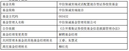 Core Viewpoint - CITIC Prudential Fund announced the departure of Liu Hongliang from the CITIC Prudential Zhi Rui Mixed Fund, highlighting changes in fund management and performance metrics [1][2]. Group 1: Fund Management Changes - Liu Hongliang has been dismissed as the fund manager of CITIC Prudential Zhi Rui Mixed Fund [2]. - Liu previously held positions at China International Capital Corporation and Haitong Securities, indicating a background in fixed income trading and asset management [1]. - The fund will continue to be managed by other fund managers Wang Rui and Zhu Huiling [2]. Group 2: Fund Performance - The CITIC Prudential Zhi Rui Mixed Fund was established on October 21, 2016 [1]. - As of November 12, 2025, the fund has achieved a year-to-date return of 8.98% for Class A and 8.88% for Class C [1]. - Since its inception, the fund has recorded a cumulative return of 76.96% for Class A and 75.32% for Class C, with net asset values of 1.7429 yuan and 1.7270 yuan respectively [1].