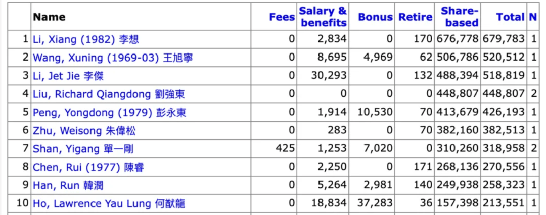 红星资本局10月14日消息,近日,香港知名股评人DavidWebb所创办的财经网站Webb-site公布2024年香港上市公司董事薪酬排行榜,其按董事总报酬由高 至低排列,收录了前1000名董事资料。 | Name | Fees | Salary & | | Share- Total N | | --- | --- | --- | --- | --- | | | | benefits | Bonus Retire | based | | 1 Li, Xiang (1982) 李想 | 0 | 2,834 | 0 | 170 676,778 679,783 1 | | 2 Wang, Xuning (1969-03) 王旭寧 | 0 | 8,695 | 4,969 | 62 506,786 520,512 1 | | 3 Li, Jet Jie 李傑 | 0 | 30,293 | 0 | 132 488,394 518,819 1 | | 4 Liu, Richard Qiangdong 劉強東 | 0 | 0 | 0 | 0 448,807 448,807 2 | | 5 Peng, Yongdong (19 ...