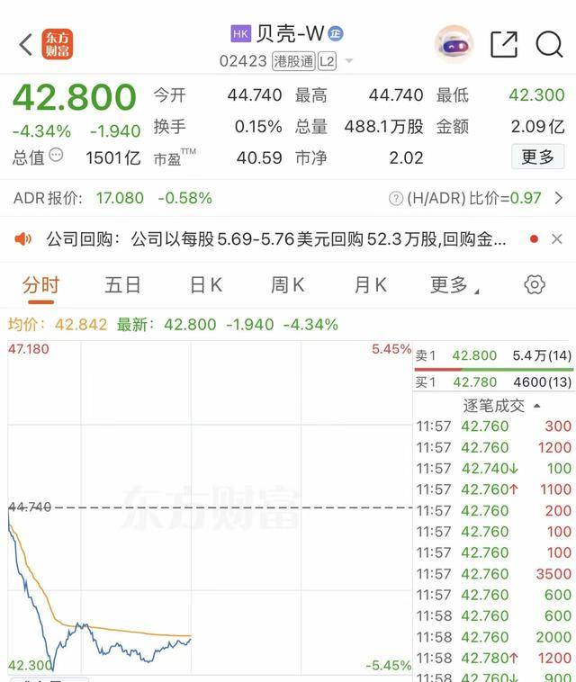每经AI快讯,贝壳-W(02423.HK)早盘一度跌超5%,截至发稿跌4.96%,报42.52港元,成交额1.85亿港 元。 ...