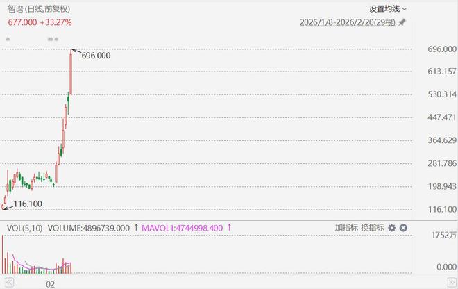 智谱(2513.HK)涨幅进一步扩大至37%,报696港元,股价再创历史新高,市值突破3000亿港元。 消息面上,公司2月12日正式推出新一代旗舰模型GLM-5,GLM-5在编程开发场景中平均性能较上一代 提升超20%,真实编程体验逼近Claude Opus 4.5水平。在BrowseComp、MCP-Atlas和τ2-Bench等三项 Agent评测中均取得开源领域最优表现。 | 智谱(日线,前复权) | | 设置均线。 | | | --- | --- | --- | --- | | 677.000 +33.27% | | 2026/1/8-2026/2/20(29根) ★ | | | 9 We're | | | | | | 696.000 | | 696.000 | | | | | 613.157 | | | | | 530.314 | | | | | 447.471 | | | | | 364.629 | | | | | 281.786 | | | | | 198.943 | | 116.100 | | | | | | | | 116.100 | | VOL(5,10) VOLUME:4896739.0 ...