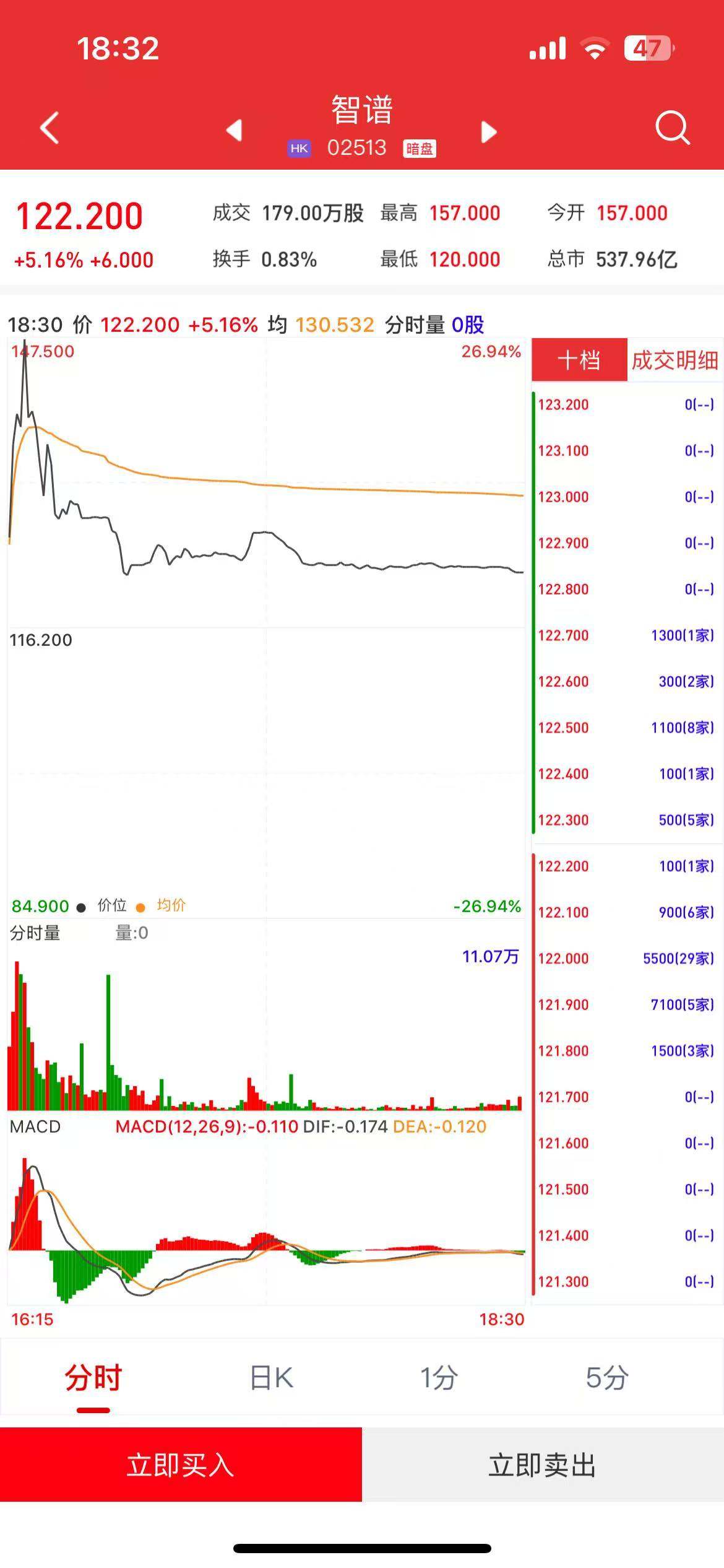 11.07万 122.000 5500( 121.900 710( 121.800 150( 121.700 MACD MACD(12,26,9) :- 0.110 DIF :- 0.174 DEA :- 0.120 121.600 121.500 121.400 121.300 16:15 18:30 分时 1分 5分 日K 立即买入 立即卖出 • 行情来源: 利弗莫尔证券 • 智谱(02513)将于2026年1月8日(星期四)在香港挂牌。截至收盘,利弗莫尔证券暗盘交易显示报价122.2港元,较招股价116.2港元上涨5.16%,每手100股,不 计手续费,每手赚600港元。 ...