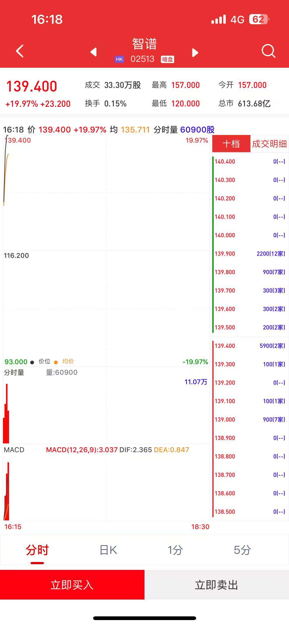 | 39.400 | 19.97% | 十档 | 成交 | | --- | --- | --- | --- | | | | 140.400 | | | | | 140.300 | | | | | 140.200 | | | | | 140.100 | | | | | 140.000 | | | 116.200 | | 139.900 | 2200( | | | | 139.800 | 90( | | | | 139.700 | 30( | | | | 139.600 | 30( | | | | 139.500 | 20( | | | | 139.400 | 5900 | | 93.000 ● 价位 ● 均价 | -19.97% | 139.300 | 10( | | 分时量 量:60900 | | | | 11.07万 139.200 100 139.100 90( 139.000 138.900 MACD MACD(12,26,9):3.037 DIF:2.365 DEA:0.847 138.800 138.700 138.600 138.500 16:15 18:30 分时 1分 5分 日K 立即买入 立 ...