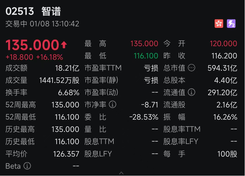 当日,智谱开盘价120港元/股,盘中股价上涨16.18%至135港元,市值将近600亿港元。 | 02513 智谱 | | | | | --- | --- | --- | --- | | 交易中 01/08 13:10:42 | | | 28 42 | | 135.000+ | 最 高 | 135.000 今 开 | 120.000 | | +18.800 +16.18% | 最 低 | 116.100 昨 收 | 116.200 | | 成交额 | 18.21亿 市盈率TTM | 亏损 总市值 ·· | 594.31亿 | | 成交量 | 1441.52万股 市盈率(靜) | 亏损 总股本 | 4.40亿 | | 换手率 | 6.68% 市盈率(动) | -- 流通值(i) | 291.20亿 | | 52周最高 | 135.000 市净率 (1 | -8.71 流通股 | 2.16亿 | | 52周最低 | 116.100 委 比 | -28.53% 振 幅 | 16.26% | | 历史最高 | 135.000 量 比 | -- 股息率TM | | | 历史最低 | 116.100 股息TTM | -- ...