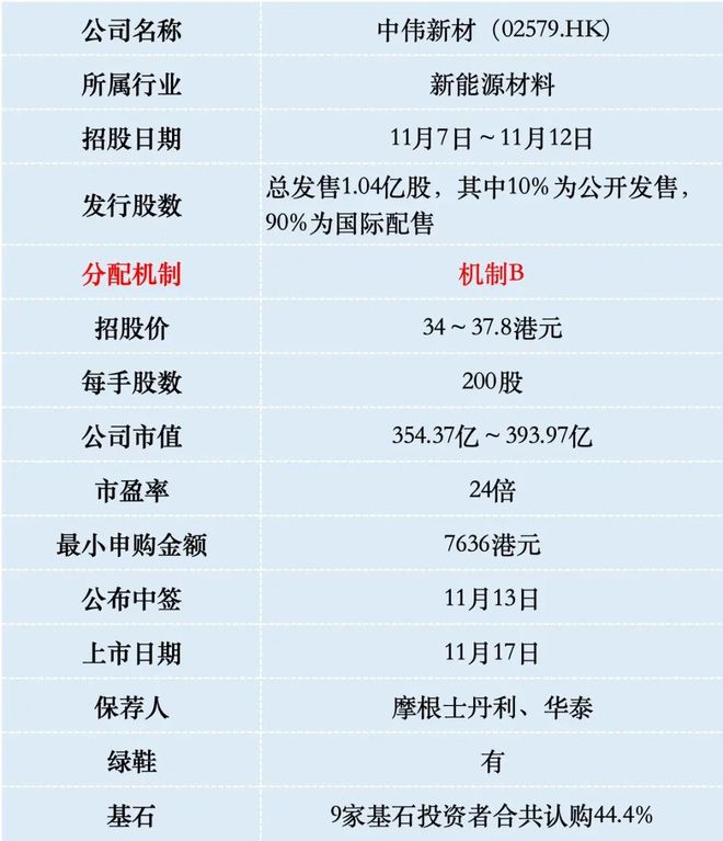 Group 1 - The company Zhongwei New Materials (02579.HK) has officially launched its global offering in Hong Kong, planning to issue 104 million shares with an offering price range of HKD 34 to HKD 37.8 per share [2] - The expected net proceeds from the offering, assuming a mid-point price of HKD 35.9 and excluding related expenses, is approximately HKD 3.6279 billion, with about 50% allocated for expanding production and supply chain capabilities, and 40% for R&D in new energy battery materials and digitalization [2] - The public offering period is from November 7 to November 12, with the final offer price and share allocation results expected to be announced on November 14, and trading on the Hong Kong Stock Exchange set to begin on November 17 [2] Group 2 - Zhongwei New Materials has a comprehensive product line that includes nickel-based materials, cobalt-based materials, phosphorus-based materials, sodium-based materials, and new energy metal products, catering to leading companies in the new energy materials, battery, automotive, and consumer electronics industries [3] - The company achieved a revenue of RMB 40.223 billion in 2024, with a growth from RMB 20.086 billion in the first half of 2024 to RMB 21.323 billion in the first half of 2025, although net profit has declined from RMB 0.863 billion in the first half of 2024 to RMB 0.735 billion in the first half of 2025 [3] Group 3 - In the third quarter of 2025, the company experienced a "revenue growth without profit growth" scenario, with a year-on-year revenue increase of 18.84% but a net profit decline of 17.33% [4] - The decline in net profit is attributed to a high level of government subsidies in the same period last year and weaker marginal contributions from low-priced inventory [4]