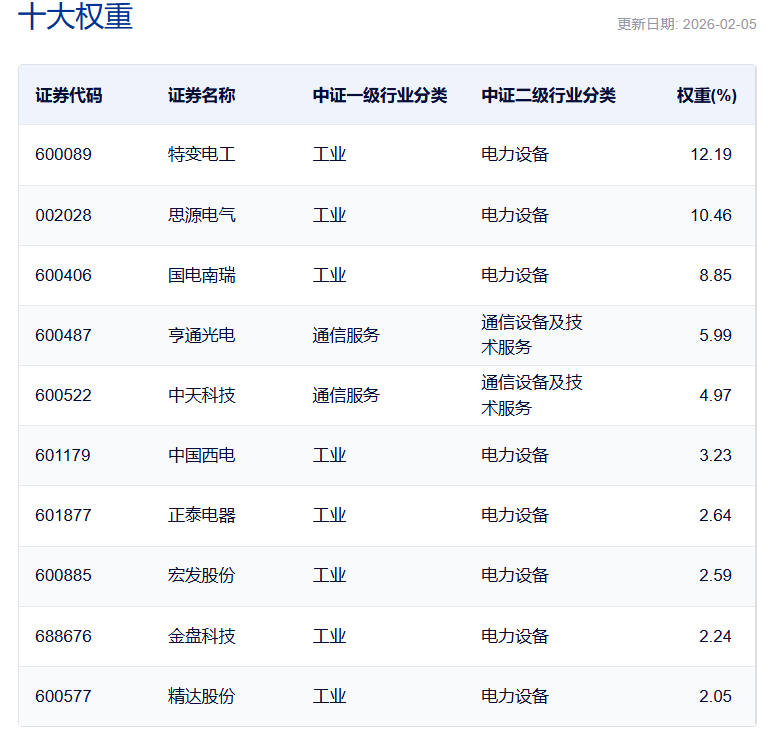 在全球能源转型持续深化、数字经济与实体经济加速融合的时代背景下,电力作为支撑各类产业运转的基础 能源,其需求结构与供给体系正经历深刻变革,行业整体迎来高质量发展的关键机遇期。而这一切的背后得 益于AI爆发带来电力需求、全球电网升级潮、国家电网4万亿投资的三重逻辑推动下: | 证券代码 | 证券名称 | 中证一级行业分类 | 中证二级行业分类 | 权重(%) | | --- | --- | --- | --- | --- | | 600089 | 特変电工 | 工业 | 电力设备 | 12.19 | | 002028 | 思源电气 | 工业 | 电力设备 | 10.46 | | 600406 | 国电南瑞 | 工业 | 电力设备 | 8.85 | | 600487 | 亨通光电 | 通信服务 | 通信设备及技 术服务 | 5.99 | | 600522 | 中天科技 | 通信服务 | 通信设备及技 术服务 | 4.97 | | 601179 | 中国西电 | 工业 | 电力设备 | 3.23 | | 601877 | 正泰电器 | 工业 | 电力设备 | 2.64 | | 600885 | 宏发股份 | TV ...