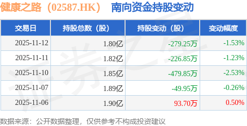 健康之路(02587.HK):11月12日南向资金减持279.25万股