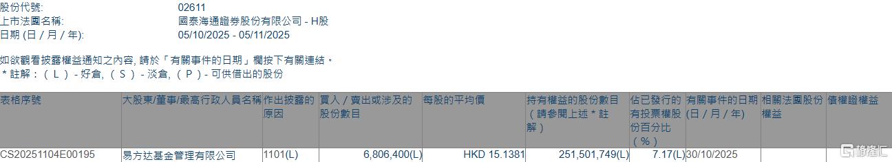 国泰海通(02611.HK)获易方达基金增持680.64万股