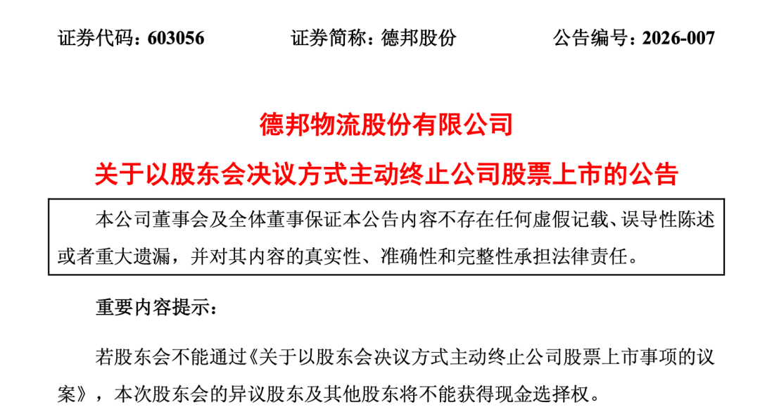 京东物流的这份承诺,也成为部分投资者购买德邦股份的原因之一。因此,围绕着"何时兑现承诺"的问题,投资者经常在互动平台上发问。 2026年1月9日午间,德邦股份突然宣布,因京东卓风拟筹划与公司相关的重大事项,公司股票于1月9日下午停牌。 1月13日晚间,德邦股份(603056)停牌谜底揭晓:公司拟主动终止在A股上市。公司将为异议股东提供现金选择权,行权价格比该股停牌前的价格高。 公告显示,为了更好地顺应物流行业的发展趋势,更为高效、有力地统筹协调与整合JD Logistics, Inc.(京东物流股份有限公司,下称"京东物流")体系内 的物流资源,亦考虑积极践行公司间接控股股东宿迁京东卓风企业管理有限公司(下称"京东卓风")收购德邦物流时作出的关于同业竞争的承诺,根据相 关法律、法规及规范性文件的规定,经京东卓风提议,并经公司董事会审议通过,公司拟以股东会决议方式,主动撤回A股股票在上交所的上市交易,并 在取得上交所终止上市决定后,申请在全国中小企业股份转让系统退市板块继续交易。 德邦股份于2018年1月在上交所主板上市,控股股东为德邦投资控股股份有限公司。2022年7月,京东集团通过下属境内子公司京东卓风,获 ...