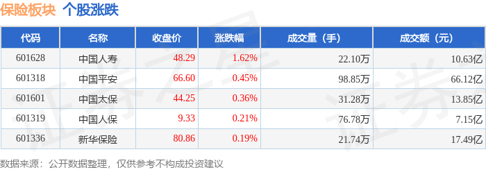 证券之星消息,1月20日保险板块较上一交易日上涨0.86%,中国人寿领涨。当日上证指数报收于 4113.65,下跌0.01%。深证成指报收于14155.63,下跌0.97%。保险板块个股涨跌见下表: | 代码 | 名称 | 收盘价 | 涨跌幅 | 成交量(手) | 成交额(元) | | | --- | --- | --- | --- | --- | --- | --- | | 601628 | 中国人寿 | 48.29 | 1.62% | 22.10万 | | 10.63 Z | | 601318 | 中国平安 | 66.60 | 0.45% | 98.85万 | | 66.12亿 | | 601601 | 中国太保 | 44.25 | 0.36% | 31.28万 | | 13.85 Z | | 61319 | 中国人保 | 9.33 | 0.21% | 76.78万 | | 7.15亿 | | 601336 | 新华保险 | 80.86 | 0.19% | 21.74万 | | 17.49 Z | 从资金流向上来看,当日保险板块主力资金净流入7.64亿元,游资资金净流出4.11亿元,散户资金净流出 3.5 ...