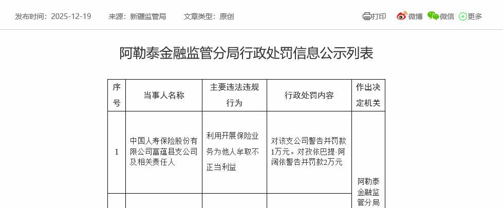中国人寿富蕴县支公司被罚 为他人牟取不正当利益
