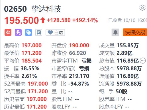 挚达科技(2650.HK)今日首日在港挂牌上市,收涨192.14%报195.5港元。挚达科技此次IPO定价为66.92 港元,公开发售获5440.80倍认购,为今年港股新股新能源领域超购王,国际配售获2.37倍认购。 挚达科技的发展始于2010年11月成立的上海挚达科技发展有限公司,2022年9月改制为股份有限公司。 公司以智慧家用电动汽车充电桩为切入点,构建了由产品、服务及数字化平台构成的"三位一体"电动汽 车家庭充电解决方案。 | 02650 挚达科技 | | | | --- | --- | --- | | 195.500 ↑ +128.580 +192.14% 已收盘 10/10 16:08 | | | | % % % 目 ♥ 白选 | | ● 快捷交易 | | 最高价 197.000 | 开盘价 190.000 | 成交量 155.85万 | | 最低价 171.200 | 昨收价 66.920 | 成交额 2.89亿 | | 平均价 185.504 | 市盈率TM 亏损 | 总市值 116.89亿 (…) | | 振 幅 38.55% | 市盈率(静) 亏损 | 总股本 5978.88万 | | 换 ...