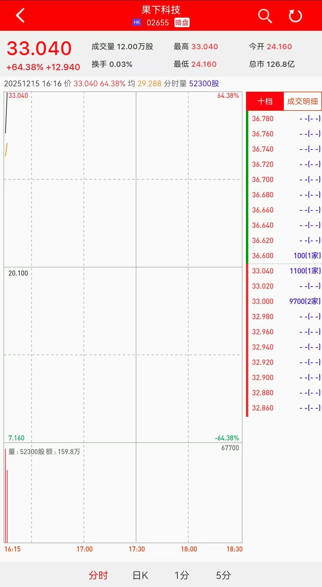 果下科技(02655)将于2025年12月16日(星期二)在香港挂牌。截至发稿,利弗莫尔证券暗盘交易显示报价33.04港元,较招股价20.10港元上涨64.38%,每手 100股,不计手续费,每手赚1294港元。 重 : 5Z3UU放 额 : 159.8万 17:30 18:30 16:15 17:00 18:00 5分 分时 1分 日K • 行情来源: 利弗莫尔证券 • | 果下科技 | | | | | --- | --- | --- | --- | | ಇ ರ | HK 02655 暗盘 | | | | 33.040 | | | | | 成交量 12.00万股 | 最高 33.040 | 今开 24.160 | | | 总市 126.8亿 | 最低 24.160 | 换手 0.03% | +64.38% +12.940 | | 20251215 16:16 价 33.040 64.38% 均 29.288 分时量 52300股 | 33.040 | 64.38% | | | 十档 | 成交明细 | | | | 36.780 | - | | | | - -(- -) | 36.760 | | | | - - ...