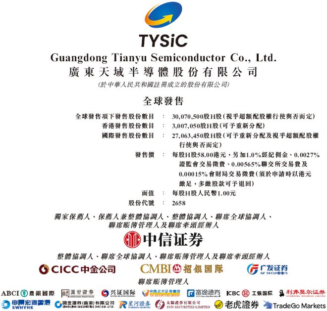 (於中華人民共和國註冊成立的股份有限公司) 股份代號:2658 全球發售 獨家保薦人、保薦人兼整體協調人、整體協調人、聯席全球協調人、聯席賬簿管理人及聯席牽頭經辦人 重 要 提 示 閣下如對本招股章程的任何內容有任何疑問,應徵詢獨立專業意見。 Guangdong Tianyu Semiconductor Co., Ltd. 廣 東 天 域 半 導 體 股 份 有 限 公 司 (於中華人民共和國註冊成立的股份有限公司) 全球發售 倘於上市日期上午八時正前出現若干情況,則保薦人兼整體協調人(為其本身及代表香港包銷商)可終止香港包銷商於香港包銷協議項 下的責任。請參閱「包銷 — 包銷安排及開支 — 香港公開發售 — 終止理由」。務請 閣下參閱該章節了解進一步詳情。 全球發售項下發售股份數目 : 30,070,500股H股(視乎超額配股權行使與否而定) 香港發售股份數目 : 3,007,050股H股(可予重新分配) 國際發售股份數目 : 27,063,450股H股(可予重新分配及視乎超額配股權 行使與否而定) 發售價 : 每股H股58.00港元,另加1.0%經紀佣金、0.0027% 證監會交易徵費、0.00565%聯 ...