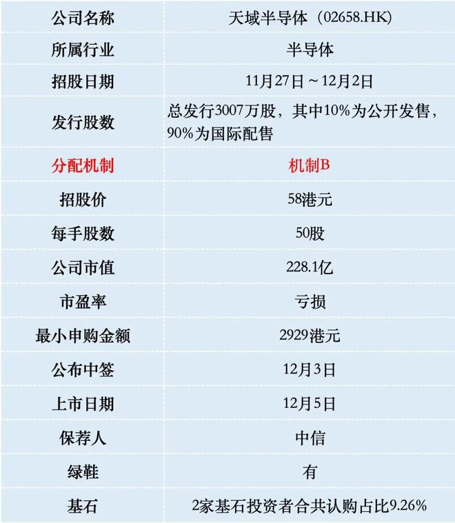 IPO 申购指南 天域半导体(2658.HK) 建议谨慎申购 2025-11-27 星期四 【招股详情】 | 保荐人 | 中信证券 | | | | | | | | --- | --- | --- | --- | --- | --- | --- | --- | | 上市日期 | 2025 年 | 12 | 月 5 | 日(星期五) | | | | | 招股价格 | 58 港元/股 | | | | | | | | 集资额 | 16.711 | 亿港元 | | | | | | | 每手股数 | 50 股 | | | | | | | | 入场费 | 2,929.24 | 港元 | | | | | | | 招股日期 | 年 2025 | 11 | 月 27 | 日-2025 年 | 12 | 月 日 2 | | | 国元证券认购截止日期 | 2025 年 | 12 | 月 1 日 | | | | | | 招股总数 | 3,007.05 | | | | | 万股(可予调整及视乎超额配售权的行使情况而定) | | | 国际配售 | 2,706.345 | | | | | 万股(可予调整及视乎超额配售权的行使情况而定),约占 ...