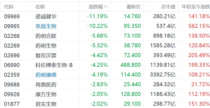 | 代码 | 名称 | 涨跌幅 ^ | 最新价 | 总市值 | 年初至今涨跌 | | --- | --- | --- | --- | --- | --- | | 09969 | 诺诚健华 | -11.19% | 14.760 | 260.21亿 | 141.18% | | 09995 | 荣昌生物 | -10.22% | 95.350 | 537.47 | 562.15% | | 02268 | 药明合联 | -5.68% | 73.100 | 898.18 Z | 138.50% | | 02269 | 药明生物 | -5.32% | 38.780 | 1585.28亿 | 120.84% | | 02696 | 复宏汉霖 | -4.42% | 72.400 | 393.49 Z | 205.49% | | 06990 | 科伦博泰生物-B | -4.25% | 488.800 | 1139.81亿 | 199.33% | | 02359 | 药明康德 | -4.19% | 114.400 | 3392.75 Z | 109.21% | | 09688 | 更鼎医药 | -2.83% | 25.440 | ...