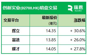 11月21日晚间,电解铝企业创新实业迎来暗盘阶段,该公司即将在11月24日正式登陆港股市场。 富途牛牛显示,该股在暗盘阶段上涨26.02%,这在近期频频破发的港股新股市场上颇为难得。 | 报价 评论 资讯 融资 分析 公司 | | | --- | --- | | 02788 创新实业 | | | 暗盘已收盘 11/21 18:29:57 | | | 13.850↑ - 最高 - 15.000 今 开 - 10.800 | | | 最 低 9.960 昨 收 +2.860 +26.02% | 10.990 | | 成交额 2.75亿 市盈率TTM 13.15 总市值 ○ 277.00亿 | | | 成交量 2059.50万股 市盈率(静) 12.36 总股本 | 20.00亿 | | 换手率 1.03% 市盈率(动) -- 流通值 ① 277.00亿 | | | 52周最高 15.000 市净率 1 | 20.00亿 | | 52周景低 9.960 委 比 92.88% 振 幅 7 | 45.86% | | 历史最高 15.000 量 比 -- 股息率TM -- | | | 9.960 股息TTM -- 股息率 ...