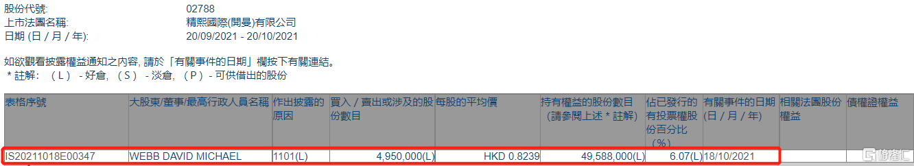 | 表格序號 | 大股東/董事/最高行政人員名稱 作出披露的 買入 / 賣出或涉及的股 每股的平均價 | | | | 持有權益的股份數目 佔已發行的 有關事件的 | | | --- | --- | --- | --- | --- | --- | --- | | | 份數目 | 原因 | | | (請參閲上述 * 註解) 有投票權股 (日 / 月 / 年 | | | | | | | | 份百分比 | | | | | | | | (%) | | | IS20211018E00347 | WEBB DAVID MICHAEL | 1101(L) | 4.950,000(L) | HKD 0.8239 | 49,588,000(L) | 6.07(L)18/10/2021 | 增持后,WEBB DAVID MICHAEL最新持股数目为49,588,000股,持股比例由5.46%上升至6.07%。 | 股份代號: | 02788 | | --- | --- | | 上市法國名稱: | 精熙國際(開曼)有限公 | | 日期 (日 / 月 / 年): | 20/09/2021 - 20/10/20 | 格隆汇APP获悉,根 ...