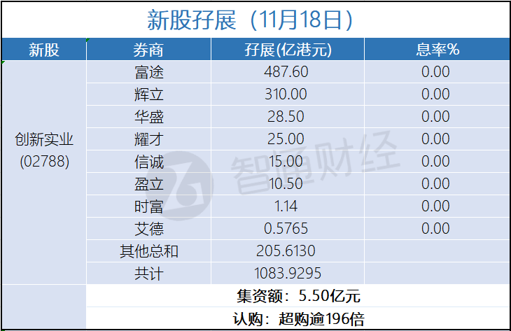 智通财经APP获悉,创新实业(02788)正在招股中。截止11月18日,富途、辉立、耀才等券商合计为创新 实业借出1083.9295亿港元,超购逾196倍。 | 新股仔展(11月18日) | | | | | --- | --- | --- | --- | | 新股 | 券商 | | 息率% | | 创新实业 | 富途 | 487.60 | 0.00 | | 辉立 | | 310.00 | 0.00 | | 化成 | | 28.50 | 0.00 | | 耀才 | | 25.00 | 0.00 | | (02788) | 信诚 | 15.00 HEI | 0.00 | | 閣立 | | 10.50 | 0.00 | | 时富 | | 1.14 | 0.00 | | 艾德 | | 0.5765 | 0.00 | | 其他总和 | | 205.6130 | | | 并计 | | 1083.9295 | | | | | 集资额:5.50亿元 | | | | | 认购:超购逾196倍 | | ...