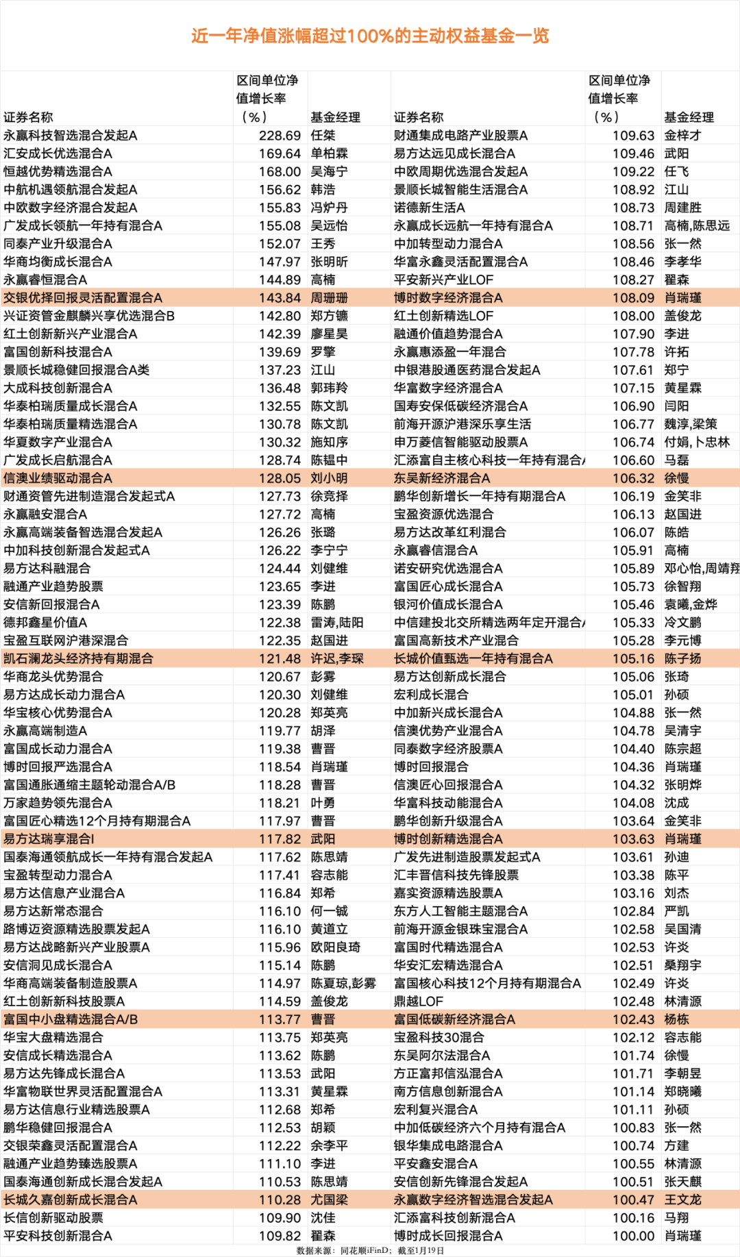 【导读】受益于有色板块行情,多只资源类基金近一年净值翻倍 中国基金报记者 天心 过去的2025年,申万一级有色金属板块大涨89.38%,位居A股榜首。2026年以来,黄金、白银价格创下新高,铜、铝等金属同样表现强势,有色金属板块 持续成为市场关注热点。受此带动,今年以来重仓相关方向的权益基金业绩水涨船高,部分重配资源类标的的周期风格基金近一年业绩翻倍。 而在翻倍的主动权益基金中,有不少资源、周期、抗通胀等相关主题品种,主要配置黄金有色等方向。比如路博迈资源精选、前海开源金银珠宝、富国通 胀通缩主题、嘉实资源精选、中欧资源精选、创金合信资源主题、宝盈资源优选。 另外,也有一些偏周期风格的主动权益基金重点配置了资源、有色相关方向,把握住了本轮行情,近一年净值涨幅翻倍。例如,截至1月19日,长城价值 甄选一年持有近一年单位净值增长率达到105.16%。截至去年三季度末,该基金前十大重仓股中绝大部分为有色金属,紫金矿业、华友钴业、洛阳钼业、 江西铜业、华锡有色、山东黄金、五矿资源等均在其中。银河价值成长近一年涨幅也成功翻倍,前十大重仓股中,也有7只为黄金有色方向。此外,截至 去年三季度末,万家趋势领先、华富永鑫等前十 ...