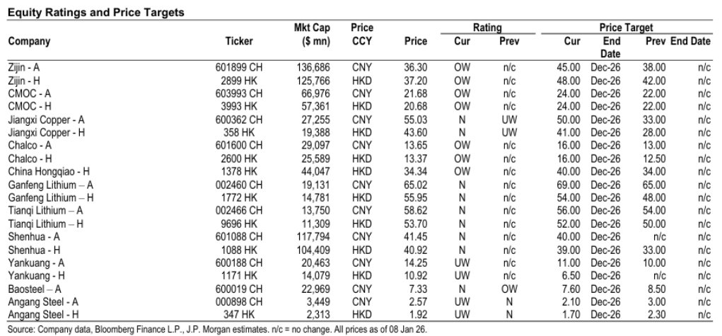 智通财经APP获悉,摩根大通近日发布研报,对中国基础材料行业在2026年的表现进行了展望。小摩指出,受供应动态驱动,MSCI中国材料指数 在2025年跑赢MSCI中国指数65个百分点。该行预计,在供应中断/紧张及进一步的并购活动的推动下,MSCI中国材料指数在2026年将继续跑赢 MSCI中国指数(1月第一周已跑赢3个百分点)。该行表示,维持对中国宏桥(01378)的"增持"评级,目标价由34港元上调至40港元,称该公司的一体 化模式有助于保持其相对于竞争对手的成本优势,并将对该股的盈利预测上调了5%。 小摩在研报中提供了若干信息,包括:1)行业整合推进:洛阳钼业(03993)收购巴西黄金资产,江西铜业(00358)收购SolGold,以及中国神华 (01088)就其此前宣布的向母公司收购资产事宜提供了更多细节。2)供应中断持续:South32将于2026年3月对Mozal铝冶炼厂进行维护保养,加拿 大铜矿商Capstone Copper旗下位于智利的Mantoverde铜金矿的罢工预计将减少7.7万吨铜供应。3)紫金矿业(02899)发布正面盈利预告,预计2025年 净利润为510-520亿元人民币(同比增 ...