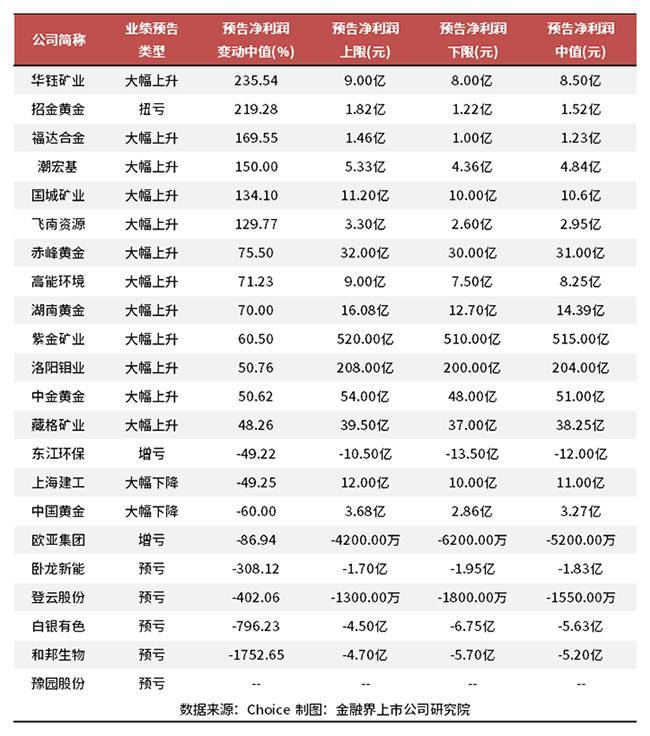 | 公司简称 | 业绩预告 | 预告净利润 | 预告净利润 | 预告净利润 | 预告净利润 | | --- | --- | --- | --- | --- | --- | | | 类型 | 变动中值(%) | 上限(元) | 下限(元) | 中值(元) | | 花狂矿业 | 大幅上升 | 235.54 | 9.00亿 | 8.00亿 | 8.50亿 | | 招金黄金 | 扭亏 | 219.28 | 1.82亿 | 1.22亿 | 1.52亿 | | 福达合金 | 大幅上升 | 169.55 | 1.46亿 | 1.00亿 | 1.23亿 | | 潮宏基 | 大幅上升 | 150.00 | 5.33亿 | 4.36亿 | 4.84亿 | | 国城矿业 | 大幅上升 | 134.10 | 11.20亿 | 10.00 亿 | 10.6亿 | | 飞南资源 | 大幅上升 | 129.77 | 3.30亿 | 2.60亿 | 2.95亿 | | 赤峰黄金 | 大幅上升 | 75.50 | 32.00亿 | 30.00亿 | 31.00亿 | | 高能环境 | 大幅上升 | 71.23 | 9.00亿 | 7.50亿 ...