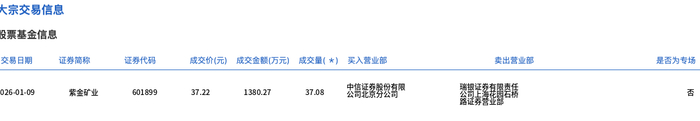 | No 22-4 082 Your 11:11 USA | | | | | | | | | | --- | --- | --- | --- | --- | --- | --- | --- | --- | | 交易日期 | 证券简称 | 证券代码 | 成交价(元) 成交金额(万元) 成交量( *) 买入营业部 | | | | 卖出营业部 | 是否为专场 | | 026-01-09 | 家零机,不 | 601899 | 37.22 37.08 | 1380.27 | 去筒硬索劈纹鸟圆 | 發開業發現實業 | | KO | 1月9日,紫金矿业大宗交易成交37.08万股,成交额1380.27万元,占当日总成交额的0.13%,成交价 37.22元,较市场收盘价37.22元持平。 ...