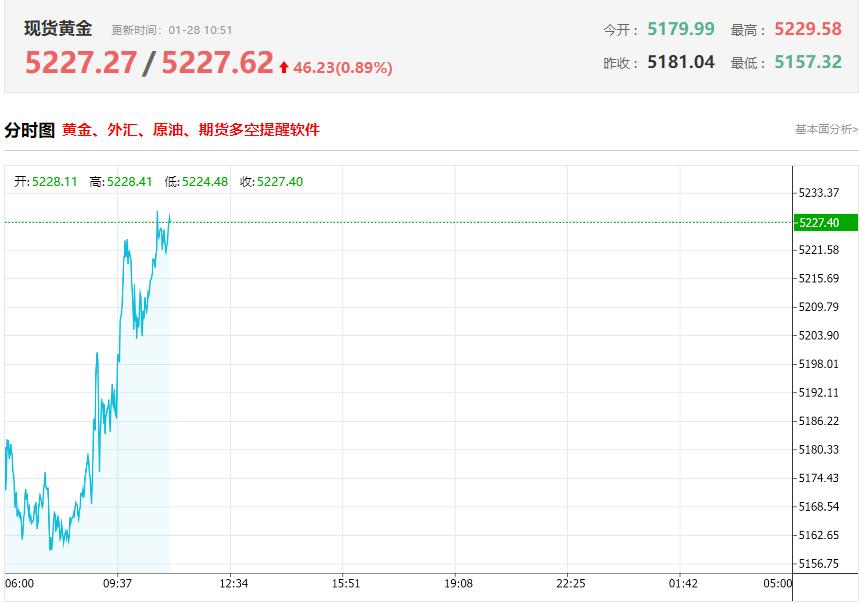 记者丨叶麦穗 李益文 编辑丨江佩霞 编辑丨王学权 1月28日,现货黄金涨势不止,盘中首次突破5300美元/盎司,日内暴涨超120美元,再创历史 新高。1月以来现货黄金累计涨近1000美元,涨幅超22%。 | | 贵金属 | | | | --- | --- | --- | --- | | 名称 | 现价 | 涨跌 | 涨跌幅 | | 伦敦金现 | 5304.613 | 122.865 | 2.37% | | 伦敦银现 | 114.860 | 2.952 | 2.64% | | COMEX黄金 | 5288.7d | 206.1 | 4.06% | | COMEX白银 | 114.310d | 8.353 | 7.88% | | SHFE黄金 | 1186.20 | 40.96 | 3.58% | | SHFE自银 | 29219 | 829 | 2.92% | | 上海会 | 1181.32 | 37.45 | 3.27% | 国际金价的飙升迅速传导至国内市场, 国内部分主流金饰品牌报价刷新1600元/克 ,周生生官 网发布数据显示,足金饰品报1614元/克,较1月27日1577元/克涨37元/克 。老凤祥报价 ...
