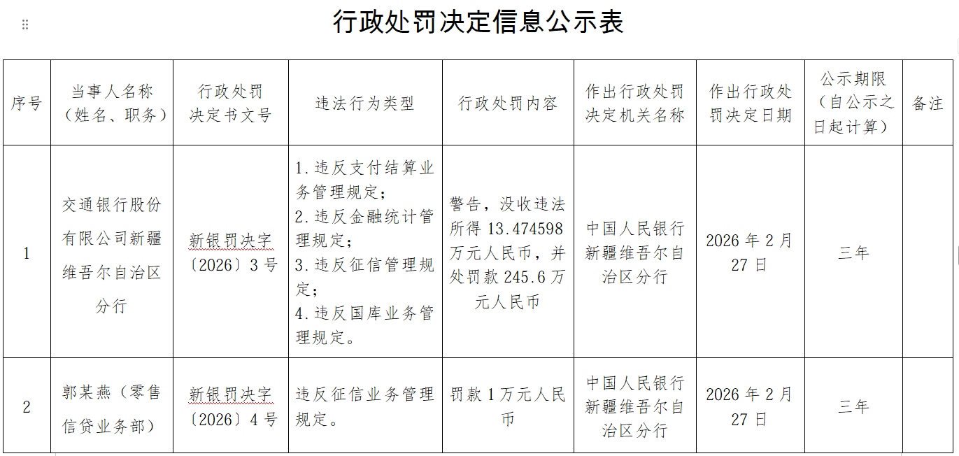 中国经济网北京3月2日讯 中国人民银行新疆维吾尔自治区分行2月28日发布行政处罚决定信息公示表(新银罚决字〔2026〕3-5号)。 其中,交通银行股份有限公司新疆维吾尔自治区分行存在以下违法行为:1.违反支付结算业务管理规定;2.违反金融统计管理规定;3.违反征信管理规 定;4.违反国库业务管理规定。中国人民银行新疆维吾尔自治区分行决定对其处以警告,没收违法所得13.474598万元人民币,并处罚款245.6万元人民币 (罚没合计259.07万元)。 郭某燕(零售信贷业务部)存在以下违法行为:违反征信业务管理规定。中国人民银行新疆维吾尔自治区分行决定对其处以罚款1万元人民币。 以下为原文: | 序号 | 当事人名称 | 行政处罚 | 违法行为类型 | 行政处罚内容 | 作出行政处罚 | 作出行两 | | --- | --- | --- | --- | --- | --- | --- | | | (姓名、职务) | 决定书文号 | | | 决定机关名称 | 罚决定 E | | | 交通银行股份 | | 1. 违反支付结算业 务管理规定: 2. 违反金融统计管 | 警告,没收违法 | | | | | 有限公司新疆 ...