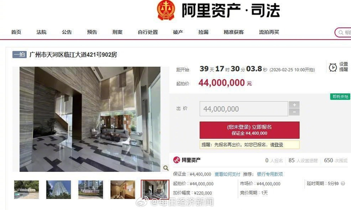 曾经被富豪圈视为身份象征的汇悦台,如今成了资产缩水的标尺。 这套位于天河区临江大道421号902房的豪宅,拥有5个卫生间、多套间布局,是小区稀缺户型。2023年 该楼盘二手房成交价普遍站稳30万元/平方米,一套300平方米户型总价轻松突破9000万元。而此次法拍 起拍价仅4400万元,单价不足14万元,甚至低于广州部分刚改楼盘价格。 贬值速度令人瞠目。2025年3月,该房产还曾以6800万元挂牌,半年后法拍价直接砍掉2400万元。这种 断崖式降价背后,是市场对恒大系资产的集体不信任。更残酷的是,即便价格腰斩,截至1月16日上架 首日,该拍卖0人报名,仅85人设置提醒,围观者多但无人出手。 二、侄子豪宅只是开始,恒大债务黑洞正在吞噬家族资产 许火健的豪宅法拍,揭开恒大家族关联企业清算的序幕。 许火健不仅是许家印侄子,更是恒大核心关联企业广州雅旭装饰设计有限公司的股东(持股20%)。该 公司原法人是许家印前妻丁玉梅,大股东是许家印胞弟许家钦,典型的家族式企业架构。随着恒大债务 危机爆发,广州雅旭陷入600多起司法纠纷,许火健因承担连带责任被列为失信被执行人。 这种家族连带清算正在扩大。此前,许家印前妻丁玉梅境外资 ...