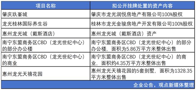 | 项目名称 | 拟公开挂牌处置的资产内容 | | --- | --- | | 肇庆玖峯城 | 肇庆市龙光润悦房地产有限公司100%股权 | | 龙光桂林国际养生谷 | 桂林市龙光金骏房地产开发有限公司100%股权 | | 惠州龙光城(戴斯酒店) | 惠州龙光城(戴斯酒店)资产 | | 南宁东盟商务区CBD(龙光世纪中心) | 南宁东盟商务区CBD(龙光世纪中心)的部分 | | 的部分办公楼 | 办公楼,面积为5.86万平方米整体出售 | | 南宁东盟商务区CBD(龙光世纪中心) | 南宁东盟商务区CBD(龙光世纪中心)的商 | | 的商业 | 业. 面积约4.35万平方米整体出售 | | 惠州龙光天禧花园 | 惠州龙光天禧花园的5套别墅,面积为1328.35 | | | 平方米整体出售 | | | 人 出 八 年 如上 短 七 七 十 十 年 | 首轮公开拍卖的起拍价不低于相关资产截至2025年6月评估价值的70%,如未成交,将按约定机制逐轮 下调起拍价。 公司透露,其目标是在首轮公开拍卖启动后的3个月内完成上述资产处置,处置所得净现金在扣除相关 成本后,按《重组议案》"第二次购回"条款用于债券回购。 来源 ...