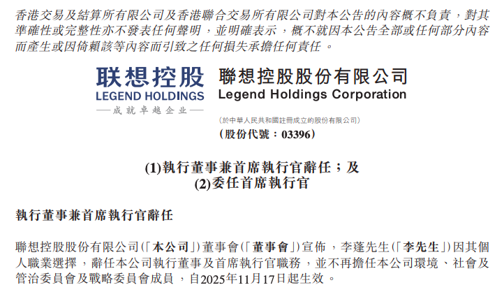 Group 1 - Lenovo Holdings announced the resignation of CEO Li Peng due to personal career choices, effective November 17, 2025, with no disagreements reported between him and the board [2] - Li Peng has been credited with leading the company's strategic and business development since becoming CEO in 2020, enhancing investment in technological innovation and improving post-investment management [2] - The company has made significant contributions to business transformation and long-term healthy development during Li Peng's tenure [2] Group 2 - Yu Hao has been appointed as the new CEO of Lenovo Holdings, previously serving as Vice President and General Manager of the Innovation Development Center [3] - Yu Hao has a strong academic background with a Bachelor's degree in Electrical Engineering and a Ph.D. in Power Systems and Automation from Harbin Institute of Technology [3] - Prior to joining Lenovo Holdings, Yu Hao worked in various multinational companies focusing on the industrialization of innovative technologies in environmental protection, energy, and high-end manufacturing [3] Group 3 - Lenovo Holdings is founded by IT pioneer Liu Chuanzhi and is a significant shareholder in companies such as Lenovo Group, Lakala, and Digital China [4] - As of the latest market close, Lenovo Holdings' stock price is HKD 9.76, with a market capitalization of HKD 23 billion [5]
