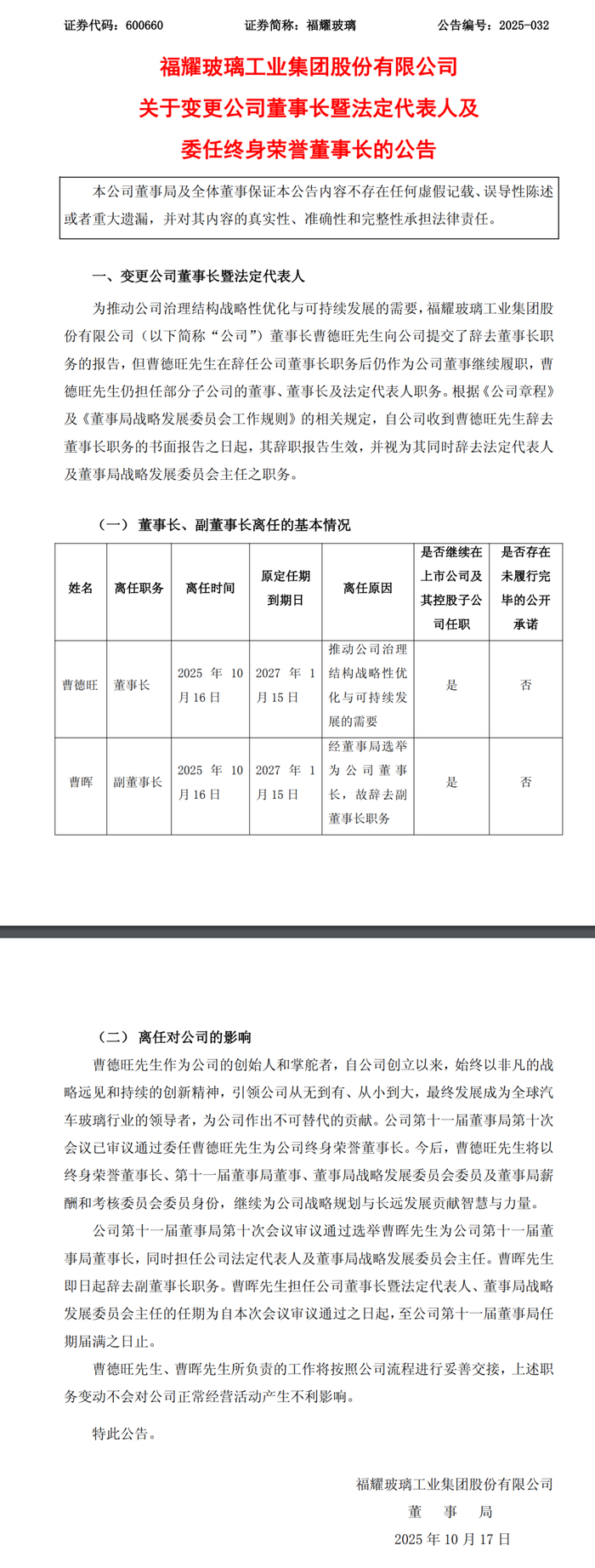 福耀玻璃称,公司第十一届董事局第十次会议已审议通过委任曹德旺为公司终身荣誉董事长。今 后,曹德旺将以终身荣誉董事长、第十一届董事局董事、董事局战略发展委员会委员及董事局薪酬和考 核委员会委员身份,继续为公司战略规划与长远发展贡献智慧与力量。 此次职务变动不会对公司正常经营活动产生不利影响。 10月16日,福耀玻璃公告,为推动公司治理结构战略性优化与可持续发展的需要,公司董事长曹德 旺向公司提交了辞去董事长职务的报告,但曹德旺在辞任公司董事长职务后仍作为公司董事继续履职, 曹德旺仍担任部分子公司的董事、董事长及法定代表人职务。 同时,公司选举曹晖为新任董事长,并任命其为法定代表人及董事局战略发展委员会主任。 ...