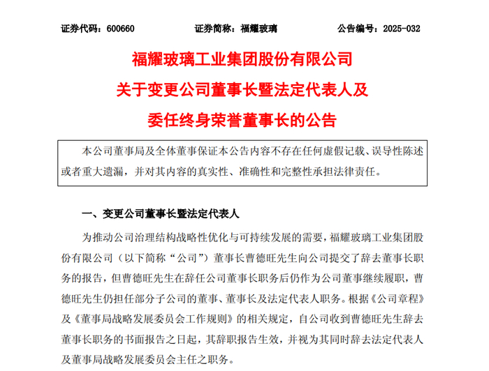 新京报贝壳财经讯 福耀玻璃10月16日公告称,公司董事长曹德旺因推动公司治理结构战略性优化与可 持续发展的需要,辞去董事长职务,但将继续担任公司董事及部分子公司的董事、董事长和法定代表人 职务。同时,公司选举曹晖为新任董事长,并任命其为法定代表人及董事局战略发展委员会主任。曹德 旺被委任为公司终身荣誉董事长。此次职务变动不会对公司正常经营活动产生不利影响。 ...