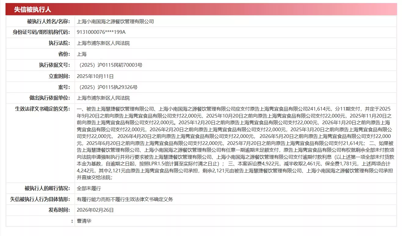 图片来源:中国执行信息公开网截图 近日,据中国执行信息公开网显示,上海小南国海之源餐饮管理有限公司因有履行能力而拒不履行生效法律文书确定义务,被上海市浦东新区人民法院列为 失信被执行人,履行情况为全部未履行。 | 失信被执行人 | | | --- | --- | | 被执行人姓名/名称: | 下通小电国海之渡餐饮复插有限公司 | | 身份证号码/组织机构代码: | 9131000076***199A | | 执行法院: | 上海市浦东新区人民法院 | | 省份: | 史上 | | 执行依据文号: | (2025) 沪0115民初70003号 | | 立室时间: | 2025年10月11日 | | 案号: | (2025) 沪0115执29326号 | | 做出执行依据单位: | 上海市浦东新区人民法院 | | 生效法律文书确定的义务: | 一、被告上海慧捷餐饮管理有限公司、上海小南国海之源餐饮管理有限公司应支付原告上海隽宜食品有限公司241,614元, 年9月20日之前向原告上海携宜食品有限公司支付22.000元,2025年10月20日之前向原告上海隽宜食品有限公司支付22.0 前向原告上海隽宜食品有限公司支 ...