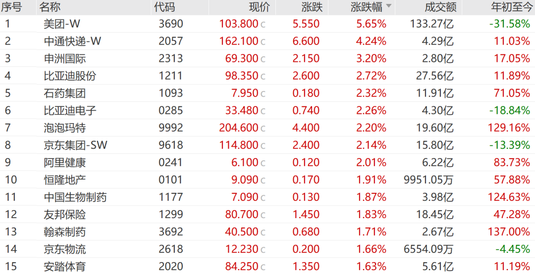 | 代码 | 简称 | 类型 | 成交金额(万港元) | 成交净买入(万港元) | 日涨跌幅(%) | | --- | --- | --- | --- | --- | --- | | 09988 | 阿里巴巴-W | 港股通(沪) | 816209.99 | 75126.03 | -1.90 | | 09988 | 阿里巴巴-W | 港股通(深) | 515351.00 | 77690.59 | -1.90 | | 03690 | 美团-W | 港股通(沪) | 363404.71 | -40280.53 | 5.65 | | 00700 | 腾讯控股 | 港股通(深) | 234132.00 | -116539.30 | -0.88 | | 01810 | 小米集团-W | 港股通(沪) | 225512.61 | 52494.07 | -0.59 | | 01810 | 小米集团-W | 港股通(深) | 222235.00 | -64895.07 | -0.59 | | 03690 | 美团-W | 港股通(深) | 218595.00 | 3617.35 | 5.65 | | 00981 | 中芯国际 ...