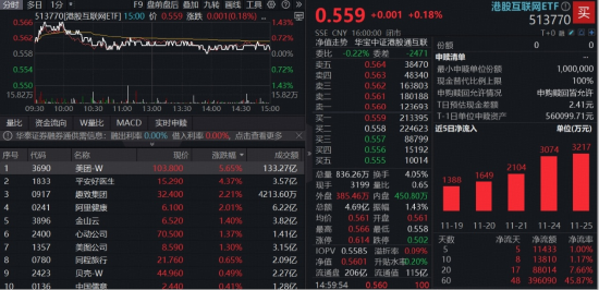 Core Viewpoint - The Hong Kong stock market is experiencing a rally driven by AI-related stocks, with the Hong Kong Internet ETF (513770) showing a three-day consecutive increase, closing up 0.18% [1] Group 1: ETF Performance - The Hong Kong Internet ETF (513770) saw a peak increase of over 1% during the trading session, ultimately closing with a slight gain [1] - The ETF has accumulated a total inflow of 114 million yuan over the past five days, indicating strong investor interest [5] Group 2: Company Performance - Alibaba's stock fluctuated, initially dropping over 2% but later recovering before closing down 1.9%, attributed to increased investments in Taobao Flash Sale and AI business, leading to a decline in operating profit for Q3 [1][3] - Alibaba Cloud achieved a revenue of over 39.8 billion yuan in Q3, marking a 34% year-on-year growth, surpassing market expectations [3] - Meituan-W led the market with a 5.65% increase, as Alibaba announced a halt in the expansion of Taobao Flash Sale, boosting market expectations for Meituan's profitability recovery [3] Group 3: Market Trends - Omdia reported that Alibaba Cloud holds a 35.8% market share in China's AI cloud market, significantly outpacing its competitors [3] - The Hong Kong stock market is seen as a unique bridge connecting Chinese innovation with global capital, with a focus on technology giants in AI, cloud computing, and semiconductors [4] - The current valuation of the Hong Kong Internet ETF is at a historical low, with a price-to-earnings ratio of 21.93, compared to 37.72 for the ChiNext Index and 34.75 for the Nasdaq 100, highlighting its attractiveness [4][5] Group 4: ETF Composition - The Hong Kong Internet ETF (513770) tracks the CSI Hong Kong Internet Index, heavily weighted towards leading internet companies, with Alibaba, Tencent, and Xiaomi making up over 45% of the total weight [7] - The ETF has a total scale exceeding 10 billion yuan, with an average daily trading volume of over 600 million yuan, indicating good liquidity [7]